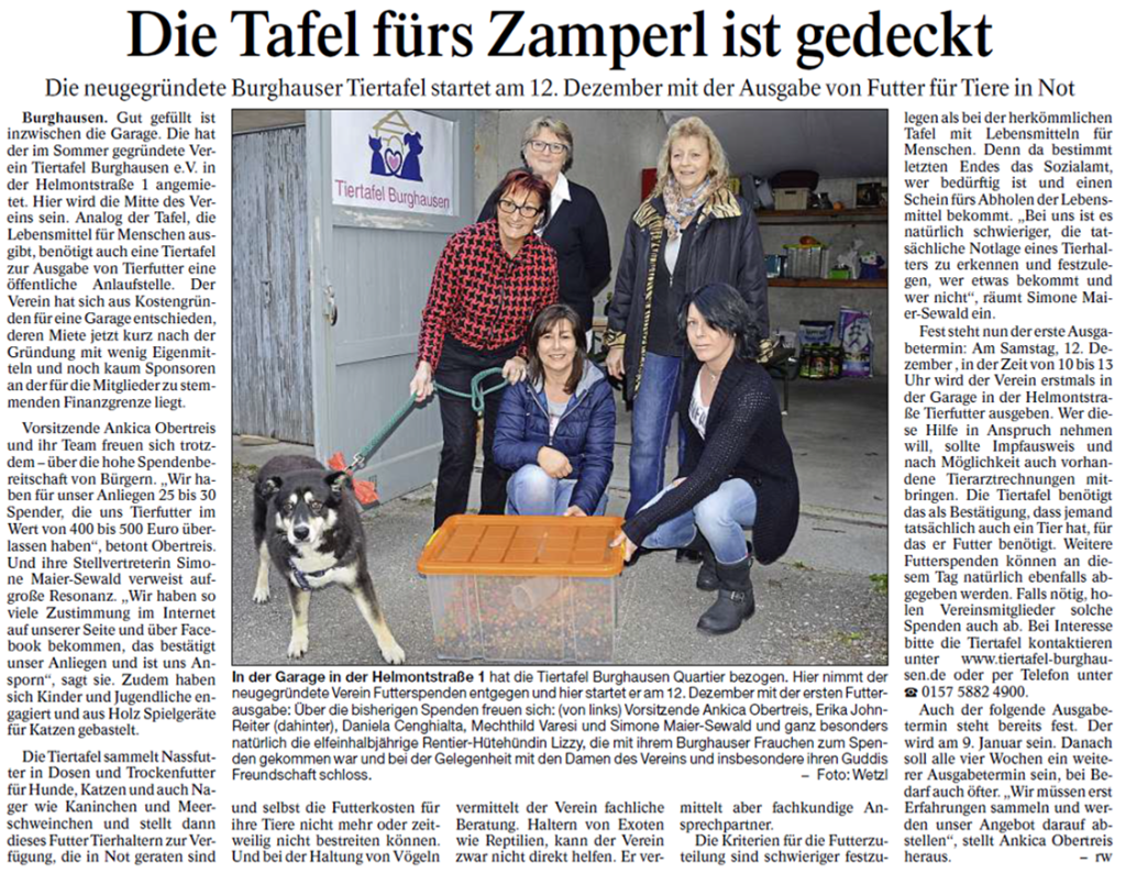 Nicht nur reden, sondern handeln und damit etwas Positives bewirken – dieser Gedanke war Auslöser für eine gute Handvoll Tierschützer, einen neuen Verein zu gründen und die "Tiertafel Burghausen" aus der Taufe zu heben. Seit Mai haben sie ihr gemeinsames Ziel verfolgt, im August erfolgte die Gründungsversammlung. Jetzt sind die Unterlagen beim Finanzamt und über einen Notar beim Registergericht eingereicht mit dem Ziel der Anerkennung als gemeinnütziger Verein. Denn erst dann kann der Verein Spenden entgegennehmen.